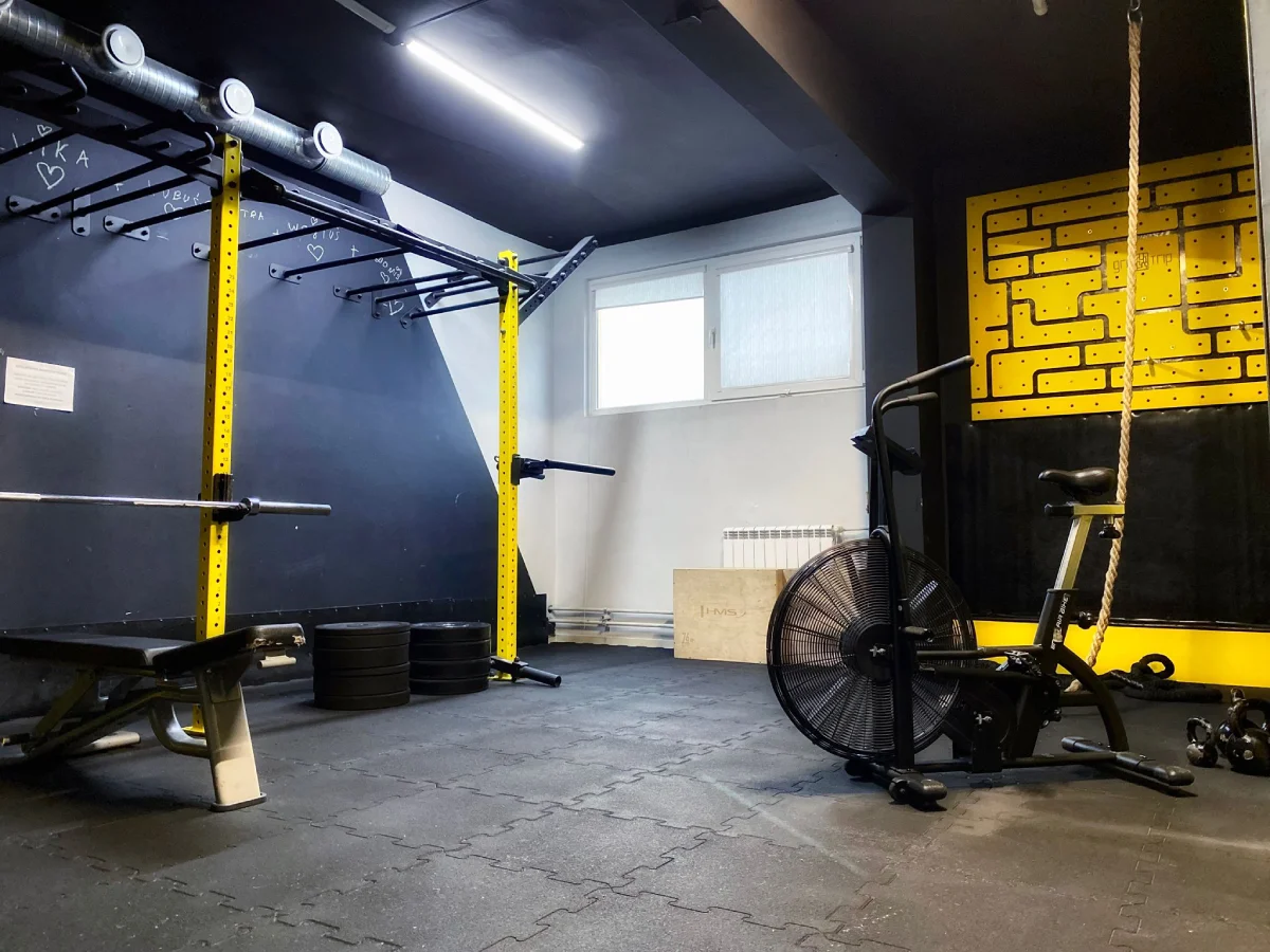 W wyposażeniu sali znajduje się sztanga olimpijska, obciążenie typu bumper, airbike, kettle, battle rope, box oraz mobinla ławka do ćwiczeń.