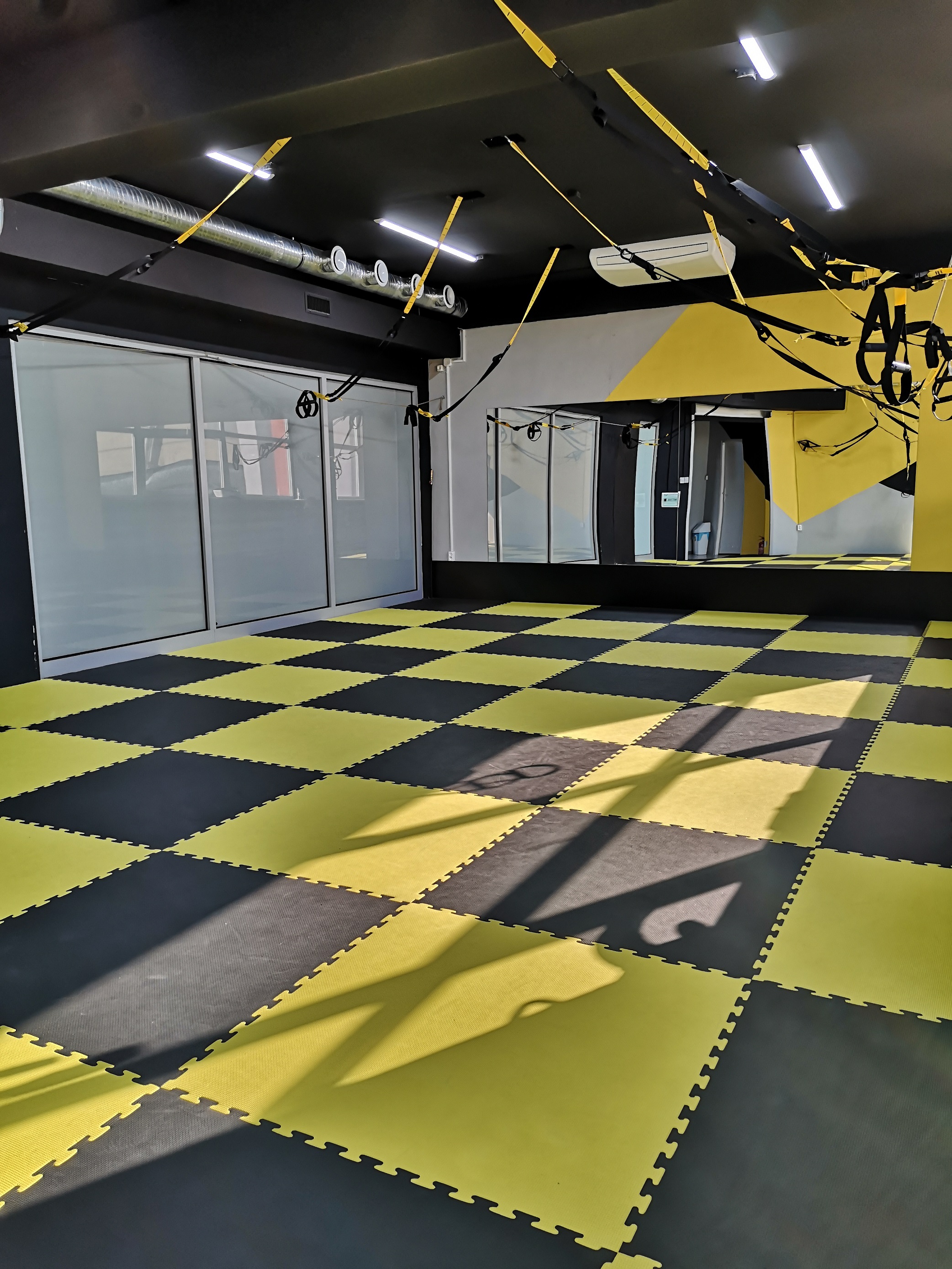 Sala z miękką podłogą, przystosowana do zajęć grupowych oraz treningów indywidualnych.